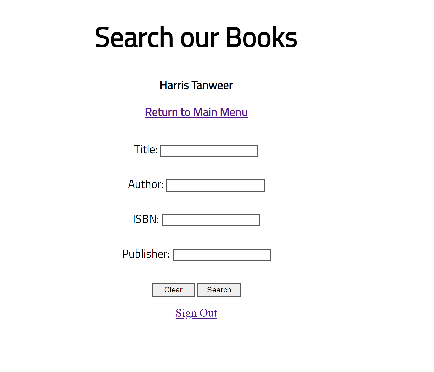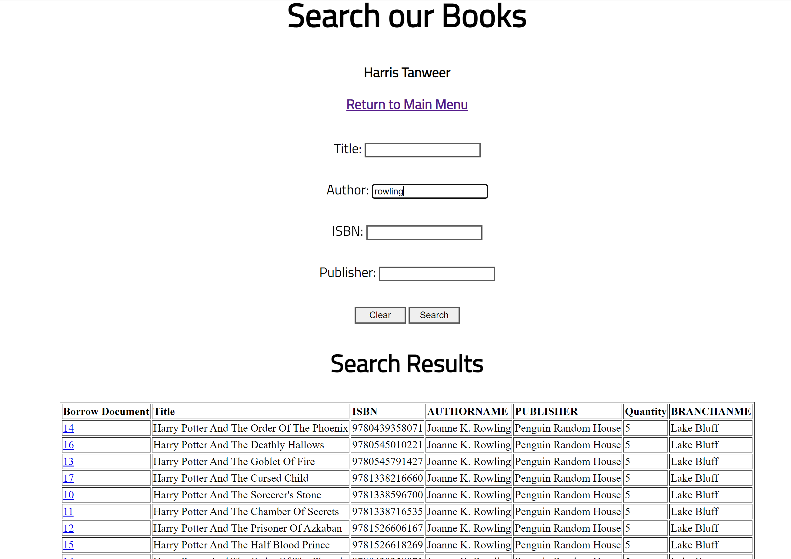 When the user first enters the site they are greeted by a welcome page with 2 login fields and a link to a sign up page. The user can log in with either an admin account or a member account. When logged in the user taken to the welcome page, and from there the user can do a a variety of operations. For a member, they can search for a document in our database, either a book, dvd, or a journal. Once they search a user can reserve the document, and a member can reserve up to 5 documents at a given time. A member can also return a document and are charged a fine of 50 cents per day over 3 days. Moving on, the admins have the same capabilities as memebrs and more. Admin's can insert a new document and search the status (if the document is checked out) of a document. The admin also has several links to reports on different statistics. For example, an admin can see the top ten most frequent borrowers or the top ten most borrowed books.